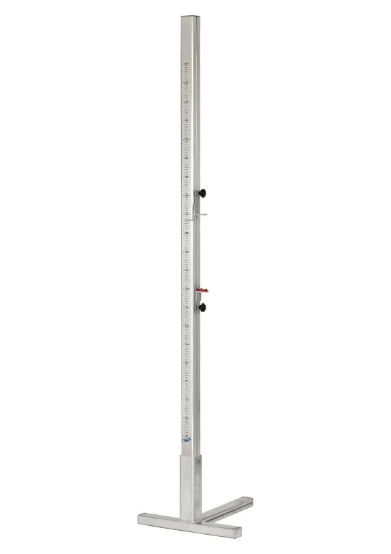 Zwei Hochsprungständer, 250 cm, komplett aus Aluminium natur, Profil 80 x 80 mm. Stabiler Standfuß in Form eines T-Fuß mit Gewichten. Die Höhenregulierung erfolgt durch stufenlos verschiebbare Verstellelemente und kann somit individuell auf die Sportler eingestellt werden.