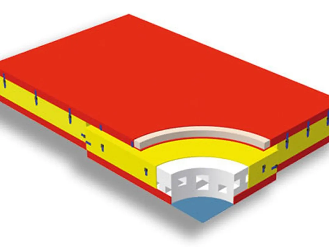Die Schaumstoff-Elemente mit Doppelhohlkammer-System mit kombinierten Polyetherschaumstoff-Stegen, sorgen für eine noch weiche Landung, da der Aufprall durch die Doppelhohlkammern besser absorbiert wird. Die Doppelhohlkammer-Schaumstoffkerne sind jeweils in einzelnen Bezügen, sodass man die Anlage auch jederzeit auf- und abbauen kann ohne den Kern zu beschädigen. Direkt auf dem Doppelhohlkammer-System liegt ein zusätzlicher Schaumstoffkern, ca. 10 cm stark. Diese, auch Schleiß- oder Spikematte genannt, schützt die Hauptblöcke vor den Spikenägeln und kann nach längerem Gebrauch kostengünstig ausgetauscht werden. Von den Hochsprungkissen Ausführungen, ist dies die Luxus-Variante. Diese Ausführung gibt es auch mit offiziellem IAAF-Zertifikat.