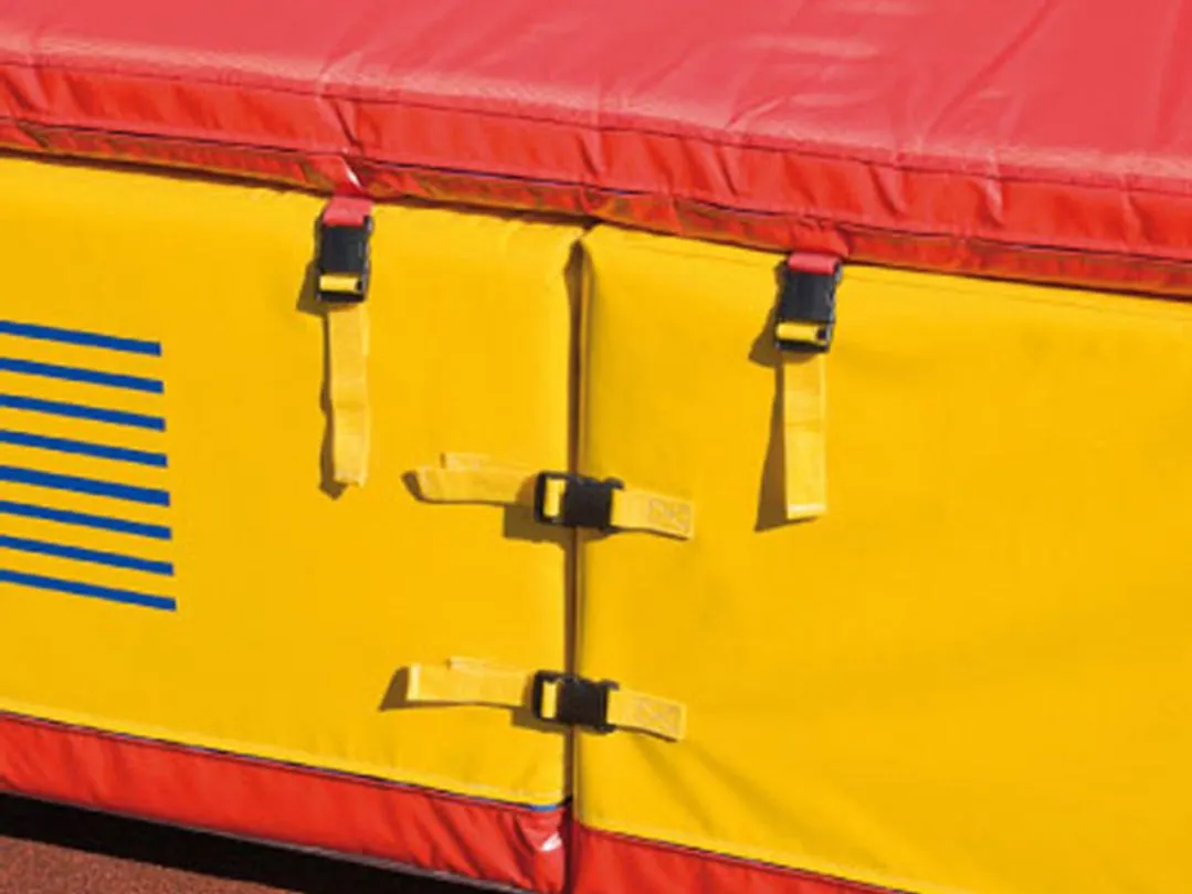 Der Überzug der Hochsprunganlage Aero-Olympia besteht aus PVC-Planenstoff mit einer reißfesten Trevira-Gewebeeinlage. Über dem Doppelhohlkammer-System wird zusätzlich ein Zwischenboden aus PVC-Planenstoff eingenäht, dadurch entsteht ein verbesserter Regenschutz. Die Schleiß- bzw. Spikematte ist mit PVC-ummanteltem und zusätzlich miteinander verflochtenem Gittergewebe auf der Ober- und Unterseite ausgestattet. Die Befestigung der Schleißmatte erfolgt über ein Kunststoff-Steckschloss-System, dadurch kann die Schleißmatte auch umgedreht werden!