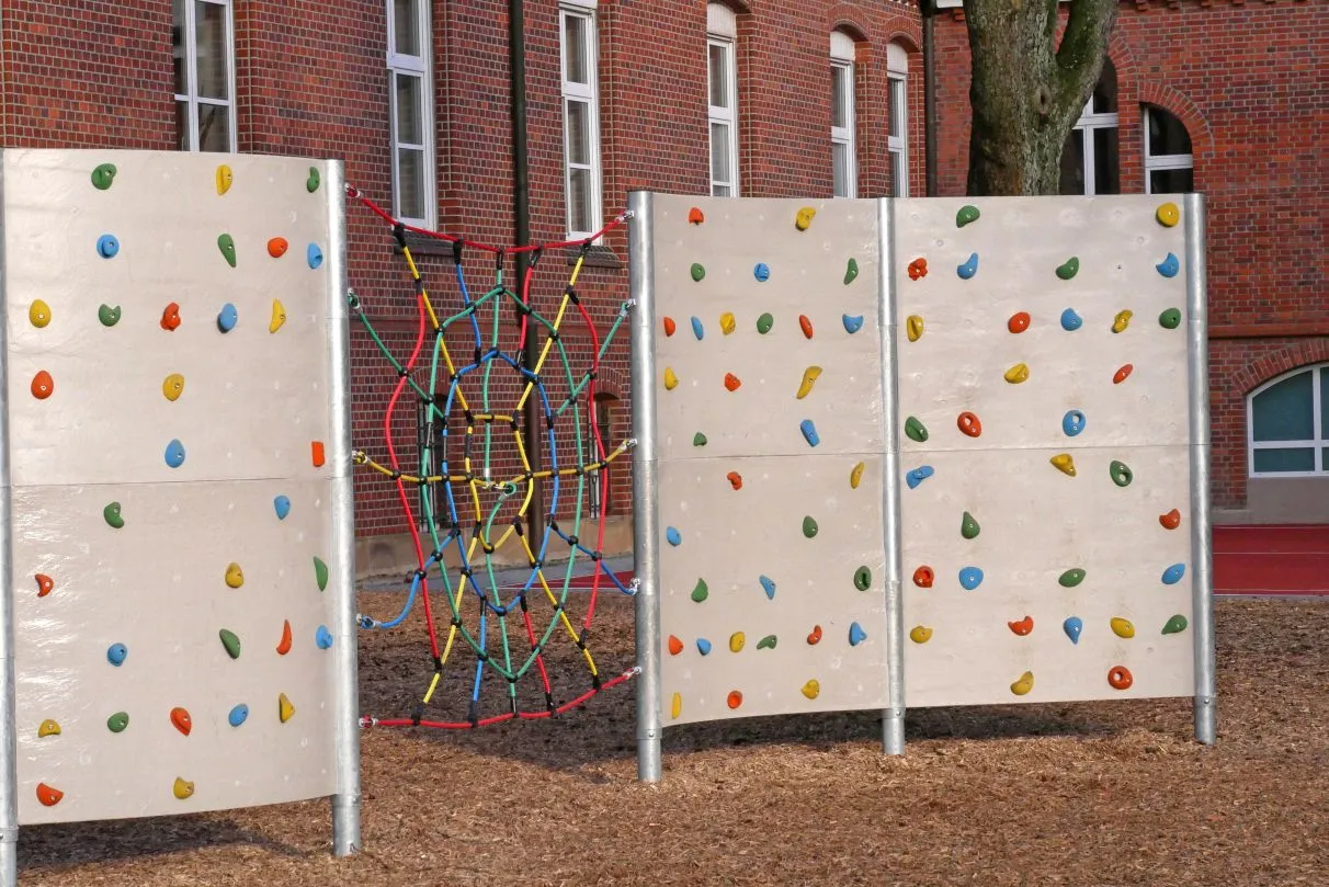 Bei der Boulderwand mit Kletternetz sind zwei zweiteilige Boulderwände aus Polymerbeton mit einem Kletternetz 3 x 2 m verbunden. Diese Kombination sorgt für Abwechslung beim Klettern. Mit einer gesamten Länge von mehr als 9 Metern und etwas mehr als 41 qm Kletterfläche ist diese Boulderwand perfekt für den Einsatz auf Schulhöfen oder Spielplätzen geeignet, da gleichzeitig viele Kinder an der Boulder wand klettern können. Diese Anlage kann nahezu überall aufgestellt werden. Durch das modulare System sind vielfältige Formen und spätere Erweiterungen möglich. Das Skelett der Boulderwände bilden feuerverzinkte Stahlrohrstützen. Diese müssen einbetoniert werden. Die ca. 5 cm starken Kletterplatten aus Polymerbeton werden über seitlich angebrachte Rohre an den Stützen befestigt. Durch die beidseitige Strukturierung entsteht eine felsähnliche Optik. 256 hochwertige Klettergriffe aus Kunstharz mit Quarzoberfläche werden angeschraubt. Als Diebstahlschutz werden diese zusätzlich fest angeklebt.