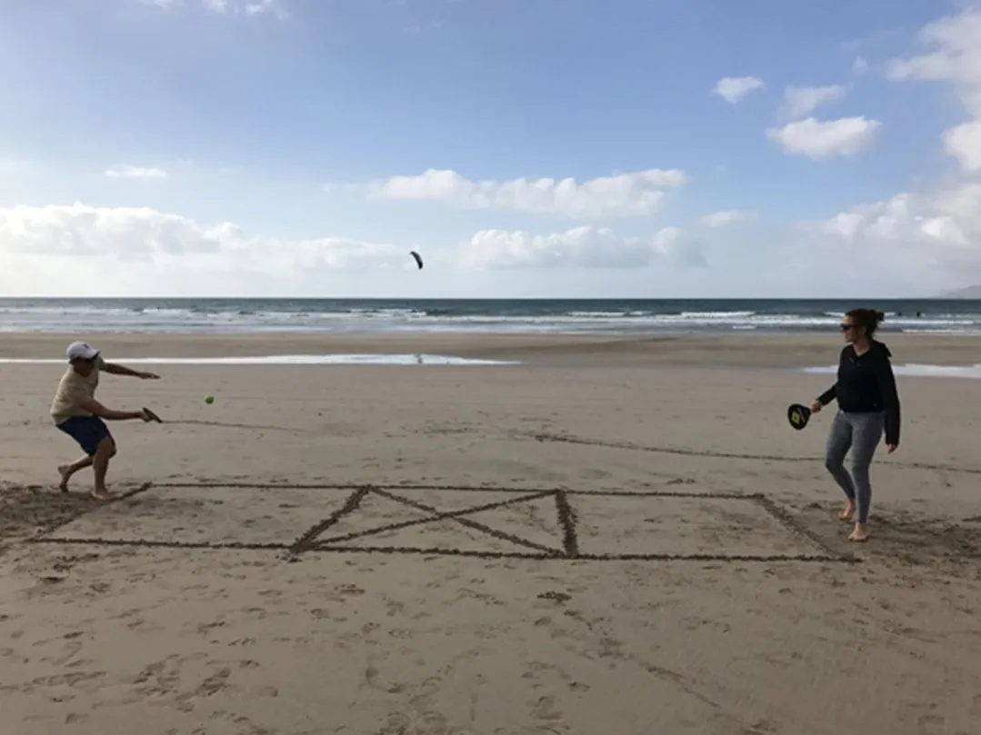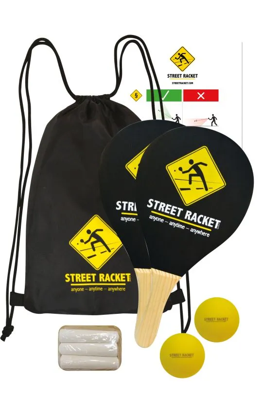 Das Set beinhaltet 2 schwarz lackierte Holzschläger mit Logoprint und wertigen Naturholzgriffen, 2 Softbälle (PU, Ø 70 mm) sowie 3x Straßenmalkreide zur Markierung der Spielfläche. Alles in Tragetasche mit Logoprint und Kordelzug verpackt.
